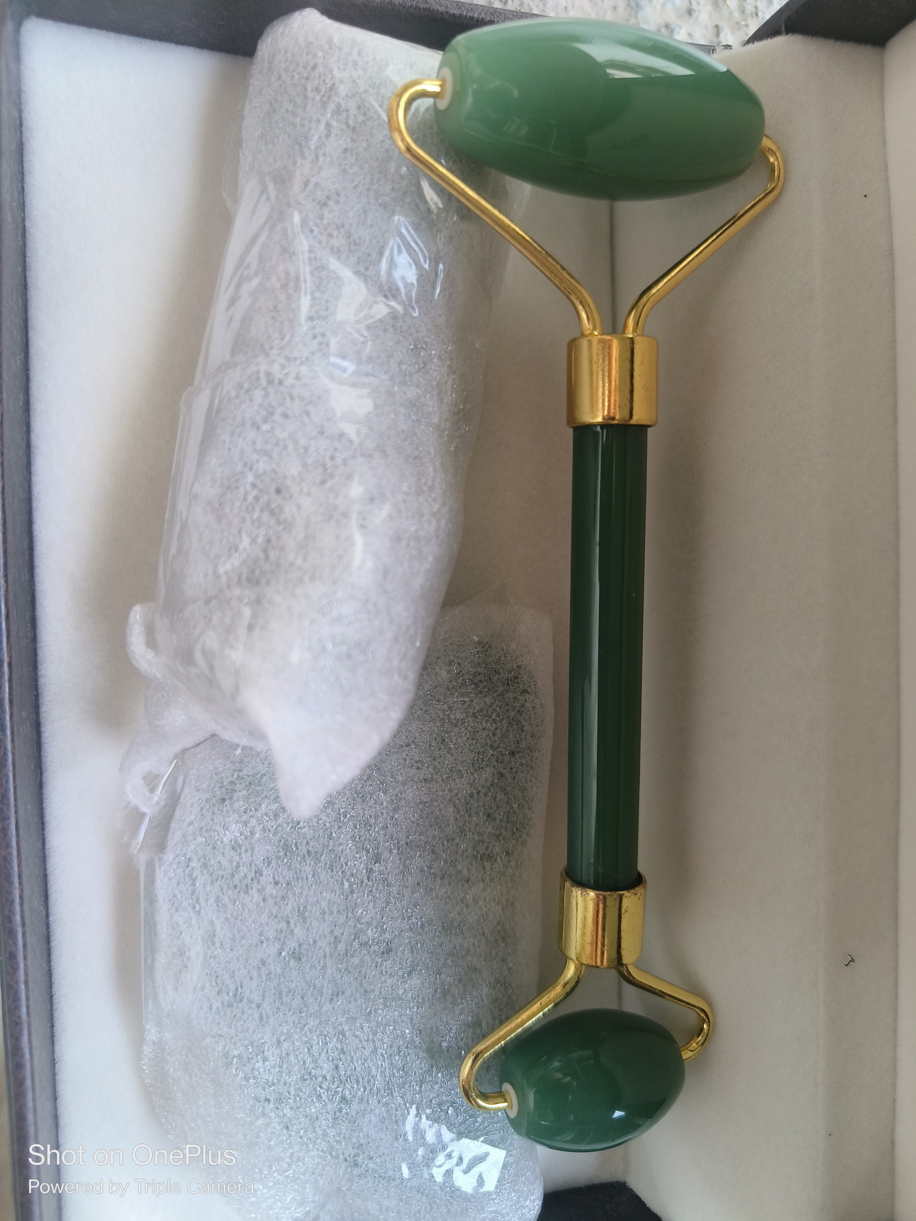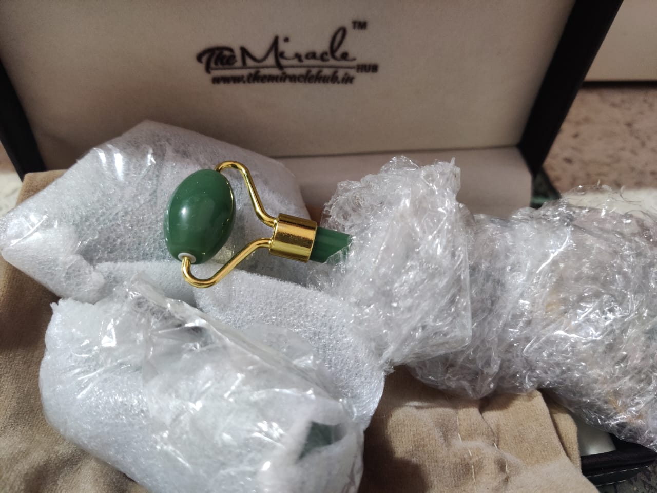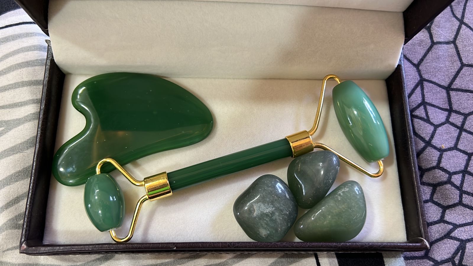 A skincare regime is incomplete without Green Jade Gua Sha Set- it gives a very effective workout to our facial muscles due to which skin glows and is relaxed. The Jade stone bring calmness, harmony and balance so using creams and lotions is great but the Jade Roller along with its marvelous energies, exercises the facial muscles- gives motion to facial muscles, and therefore keeps skin fit and healthy, and keeps it from aging. Gua Sha works with the Jade stone. The green Jade Tumble stone brings harmony. Gua Sha promotes softening of wrinkles and lines on the face, lymphatic drainage, good complexion, shapes cheekbones and jawline, reduces acne and acne scars, reduces puffiness and dark circles. This wonderful set of Gua Sha scraper and Jade Roller helps blood flow to the face, making the complexion glow, retarding aging; it manages pain of head, face and even migraine, and reduces acne and pimples. The jade crystal nurtures, heals, replenishes and works positively on your emotions and life force. In short it gives you stress free skin, which makes you happy and feel confident.