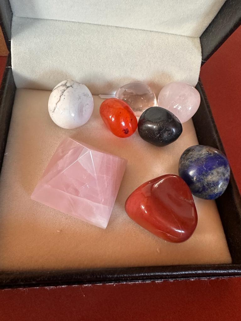 Crystals: Rose quartz, Carnelian, Clear quartz, Garnet, Moonstone, Lapis Lazuli, Carnelian